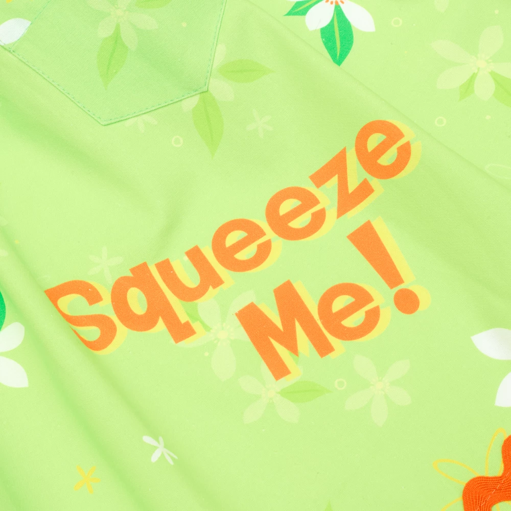 Vous ne manquerez jamais de jus en cuisine ! InspirĂ© d’Orange Bird, ce tablier est garni d’un imprimĂ© floral, d’un motif personnage et de l’inscription « Squeeze Me! » (Pressez-moi !).